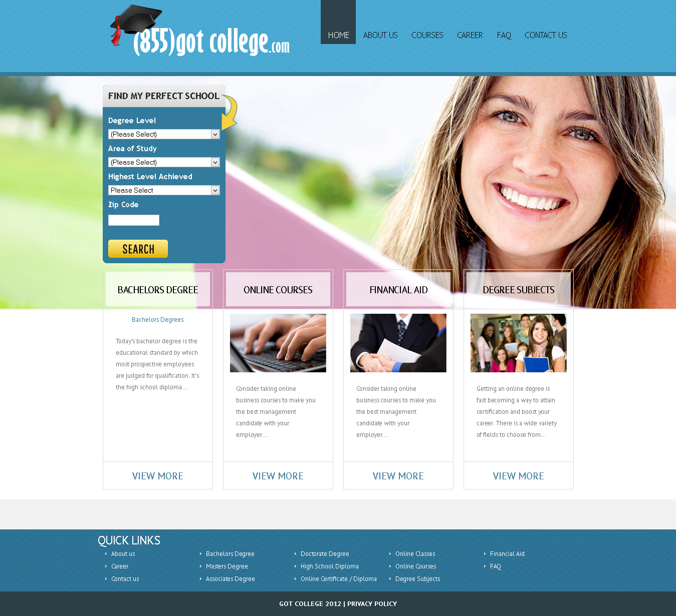 (855)GotCollege is a team of Education professionals who are truly dedicated your future! We can make sense of all the options regarding your continuing education. 855GotCollege.com is a reliable lead source of college information. We have helped Thousands of students across the country find the right school and program to fit their needs. Whether it’s Campus-based or Online learning that interests you, we provide valuable information about accredited colleges, universities and career training institutions. We can offer you financial aid options and we’ll inform you about student life too!